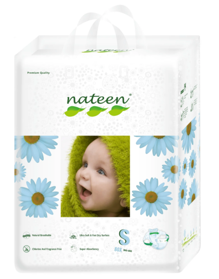 NATEEN PREMIUM LINE SMALL (Size 2), 80 BUC - scutece ecologice pentru bebeluși, 4-6 kg - Protecție împotriva scurgerilor, scutece de unică folosință super absorbante, hipoalergenice cu fixare confortabila 3D Flex&Fit
